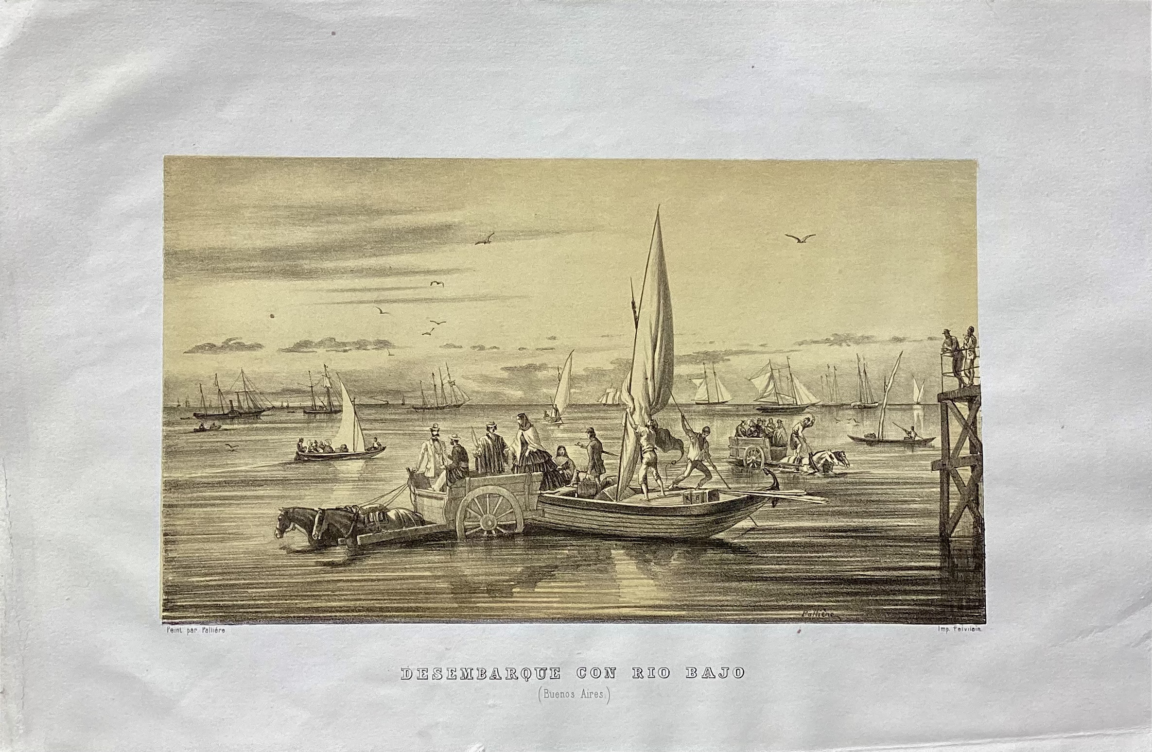 "DESEMBARQUE CON RIO BAJO" (Buenos Aires); 1864, LÉON PALLIÈRE, very rare Argentinian lithograph.