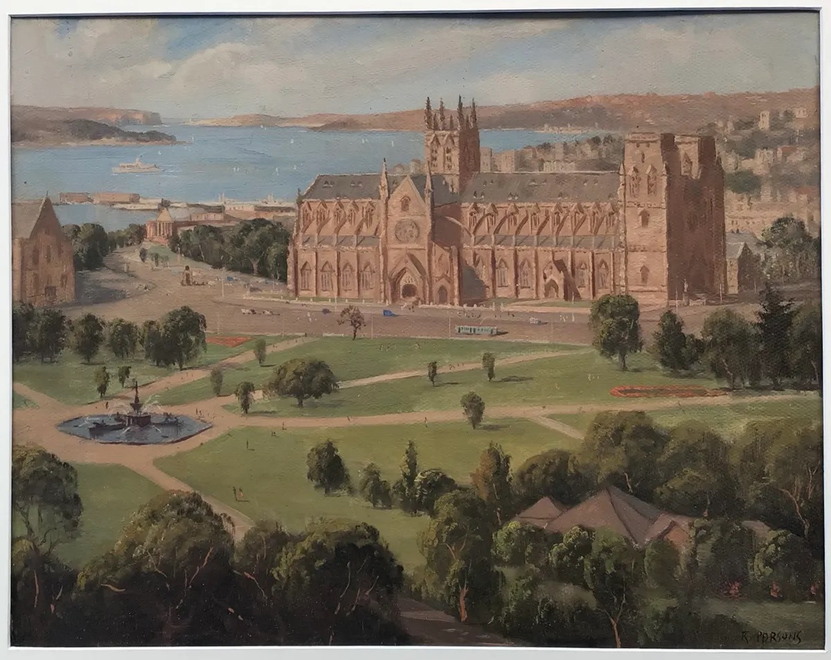 “ST. MARY'S CATHEDRAL WITH SYDNEY HARBOUR IN THE BACKGROUND", LEON WILLIAM HAlNSON, 1950s; Oil on canvas.