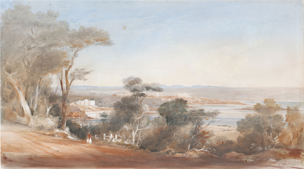 A superb Sydney Harbour watercolour c. 1845 by Conrad Martens, sweeping from Elizabeth Bay House in the middle-ground around to the lower north shore, showcasing Martens’s remarkable talent at capturing the shimmering waters and the intense light of the city.