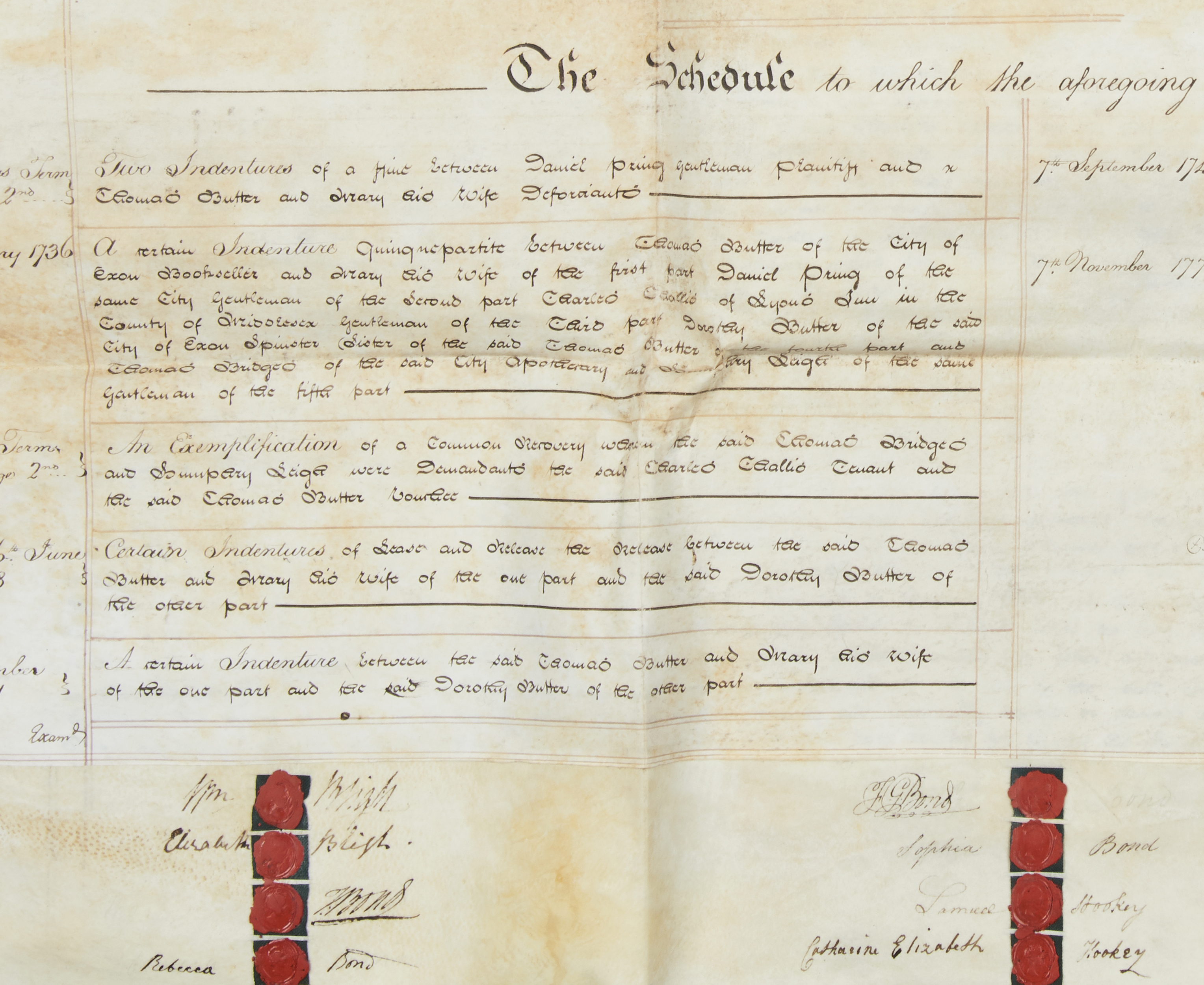 A remarkable group of manuscripts regarding the ownership of a property in Exeter over a period of a century and involving William Bligh and numerous close family members. The collection includes a rare example of the signatures of both William Bligh and his wife Elizabeth on the same manuscript document, together with the signatures of Bligh’s nephews Thomas and Francis Godolphin Bond (both of whom had long careers in the Royal Navy, and the latter of whom went on Bligh’s second breadfruit voyage and kept up an important and revealing correspondence with his uncle).