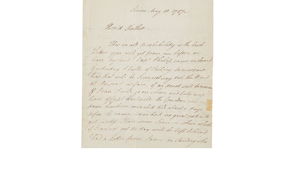 A wonderful original letter by Newton Fowell, the eighteen-year-old midshipman on HMS Sirius whose moving and evocative letters from the First Fleet have been one of the treasures of the State Library of New South Wales since they were acquired in 1987. This candid letter to his father John Fowell of Black Hall, North Huish, Devon, is dated “Sirius, 10 May 1787” and was written aboard the flagship of the First Fleet just three days before she set sail for Botany Bay.